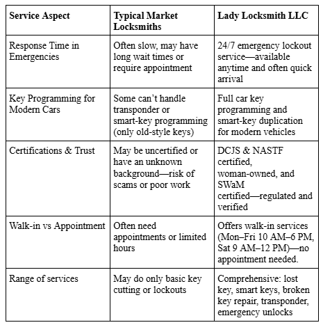 Most locksmiths or key-replacement services try to help, but there are big differences depending on who you call. Here’s how Lady Locksmith LLC compares with a typical or general market service: